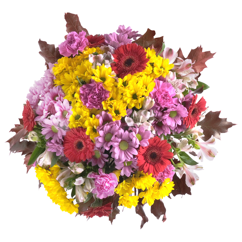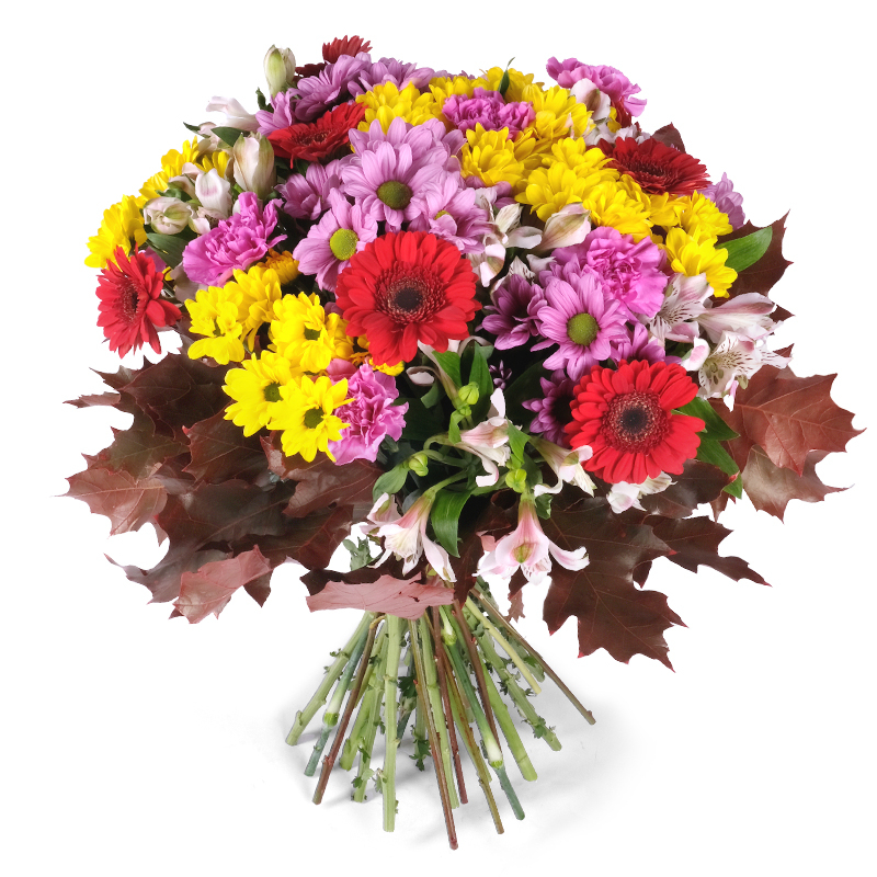 Gerbery otoczone gęstymi margerytkami i wdzięcznymi alstromeriami tworzą kompozycję, która zachwyca zarówno z bliska, jak i z daleka. Dekoracyjne liście podkreślają naturalny charakter bukietu. Każdy, kto go zobaczy, doceni wysiłek i dobre intencje.