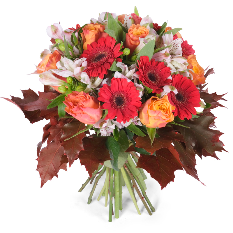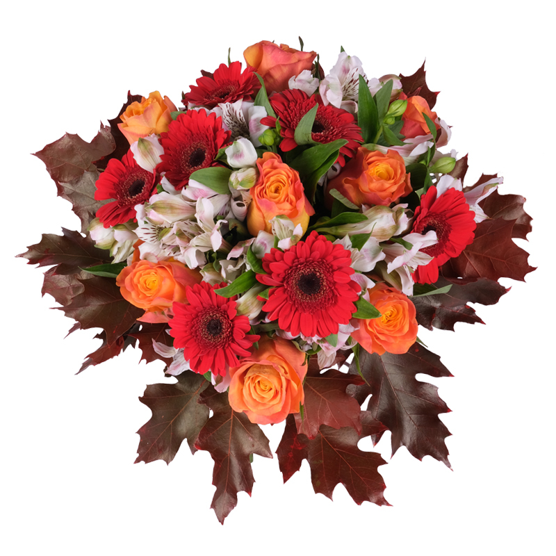 Kolorowa jesień to bukiet, który w pełni oddaje magię i urok najbardziej malowniczej pory roku. Róże emanują ciepłem,gerbery dodają energii, a alstromerie subtelnie dopełniają kompozycję swoją finezją. Całość ukryta w jesiennych liściach to świetny prezent dla każdego!