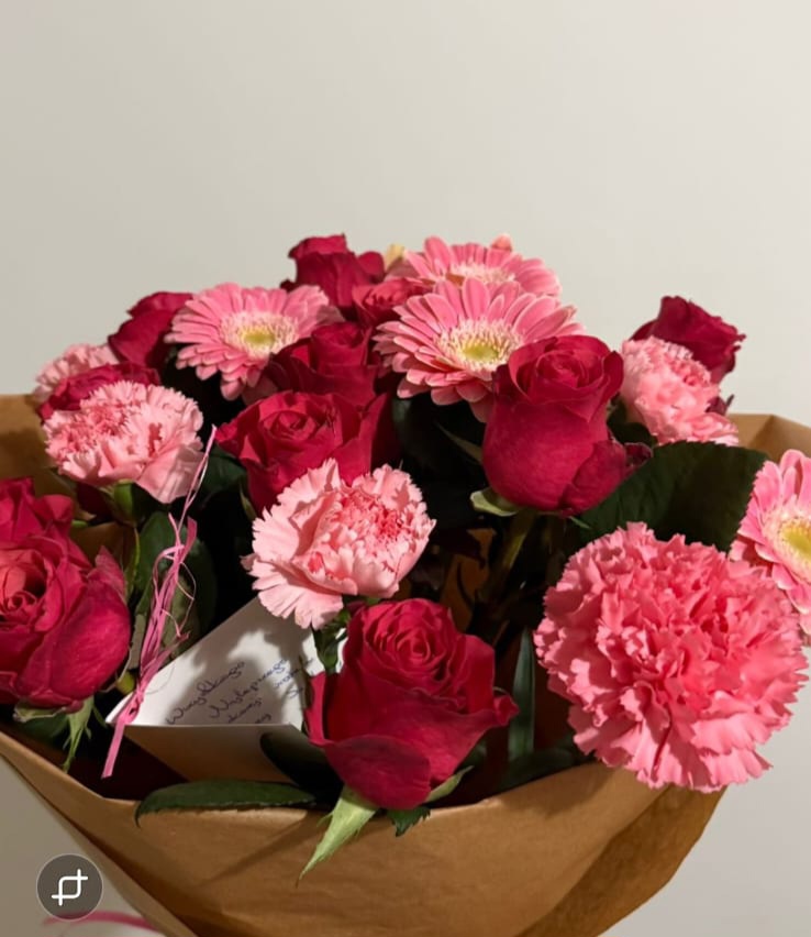 Przekaż subtelną kompozycję kwiatową i spraw mnóstwo uśmiechu! Przedstawiony bukiet składa się z róż, gerber i goździków w różowo-jasnej barwie, świetnie sprawdzi się jako upominek np. na imieniny. Do pięknego bukietu dodany jest gratisowy bilecik, na którym możesz przesłać wiadomość. Papier stanowi nowoczesną formę dekoracji bukietu. Papieru nie należy usuwać przed włożeniem do wazonu, gdyż stanowi integralną część dekoracyjną kompozycji. Bukiet nie zawiera zielonego przybrania.